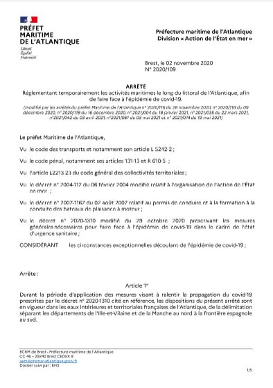 Arrêté préfectoral maritime réglementant les activités maritimes le long du littoral de l'Atlantique, afin de faire face à l'épidémie du Covid 19